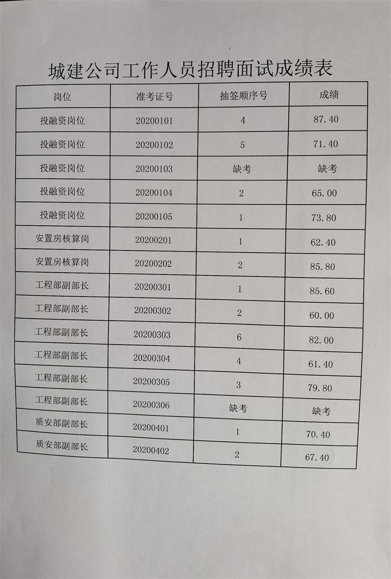 宜昌市點(diǎn)軍城鄉(xiāng)建設(shè)開發(fā)有限公司2020年公開招聘工作人員面試于2020年12月12日結(jié)束,現(xiàn)將面試成績(jī)公示如下,如有疑問請(qǐng)于工作日撥打公司電話咨詢。電話為0717-6622026,公示期5天。