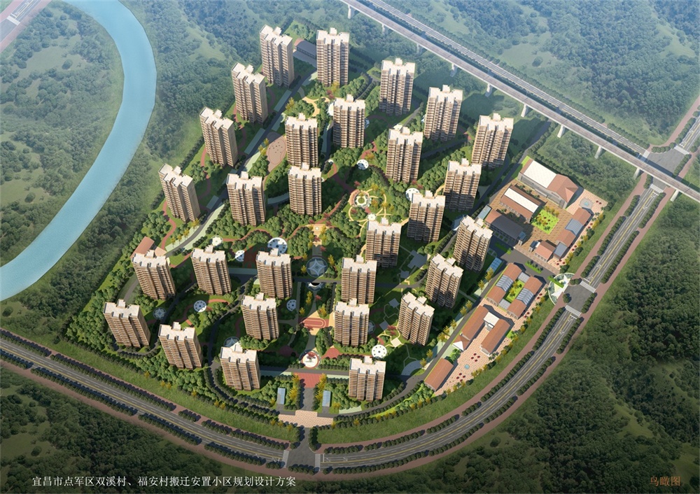 雙福家園安置房小區(qū)位于點軍區(qū)雙溪村,占地290.73畝,總建筑面積為530098.91平方米,其中住宅建筑面積為386016.14平方米,商業(yè)面積為18162.2平方米,配套公建面積為11329.44平方米,總投資約14.8億。容積率2.2,綠地率38.7%,安置戶數(shù)3584戶。共有37棟單體建筑,其中28棟32層高層住宅,配備了幼兒園、村民禮堂、菜市場、村民活動中心、商業(yè)街及配套配電室、球場等配套設(shè)施,共設(shè)停車車位2800個。