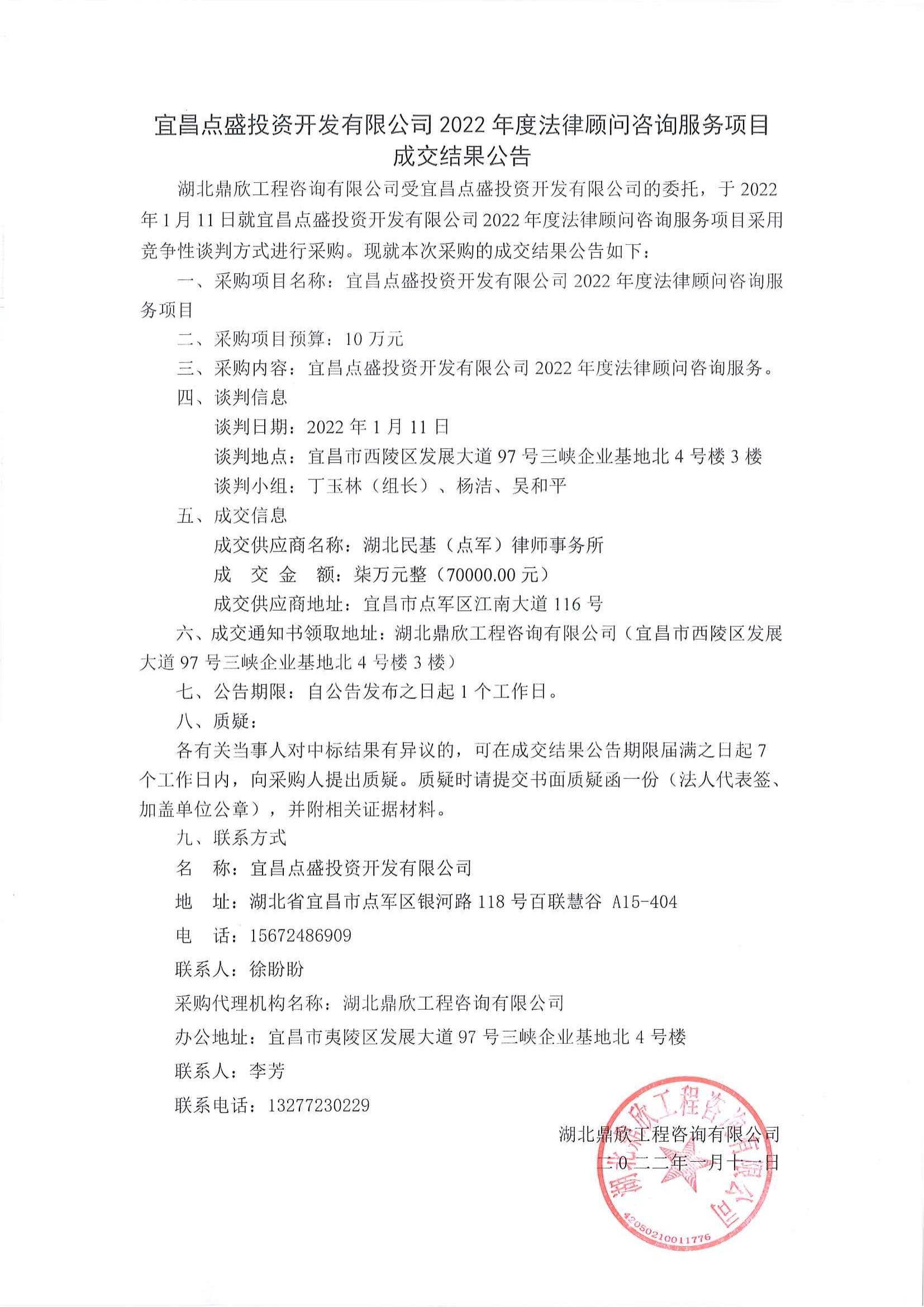 宜昌點盛投資開發(fā)有限公司2022年度法律顧問咨詢服務(wù)項目成交公告