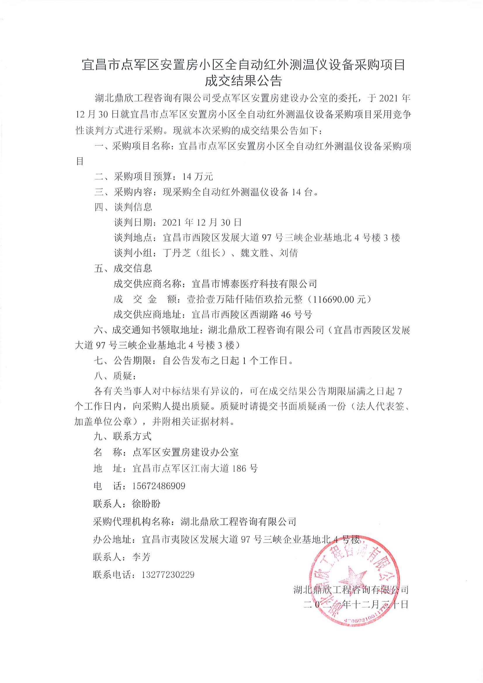 宜昌市點(diǎn)軍區(qū)安置房小區(qū)全自動紅外測溫儀設(shè)備采購項目成交公告