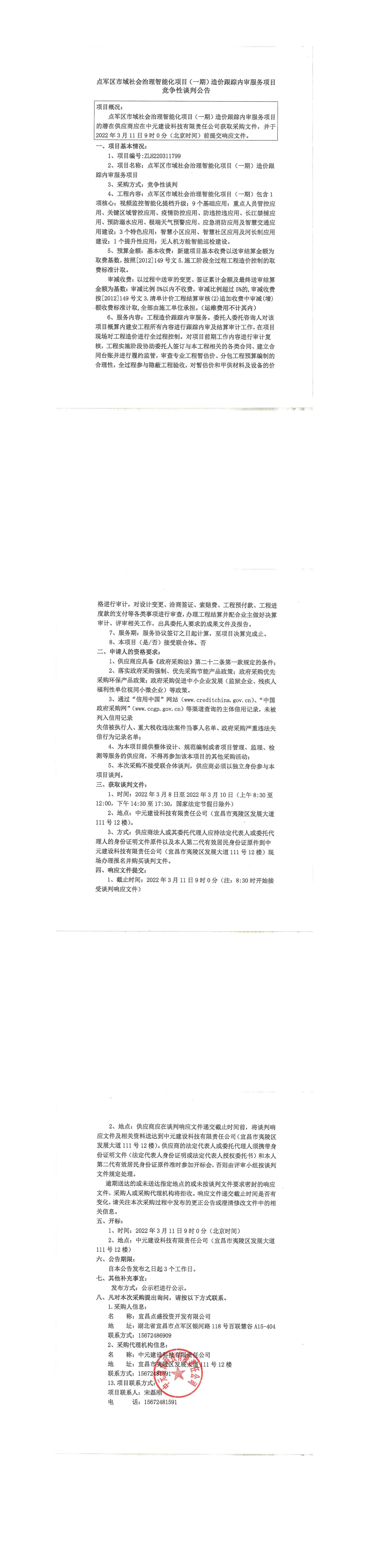點軍區(qū)市域社會治理智能化項目(一期)造價跟蹤內(nèi)審服務(wù)項目談判公告