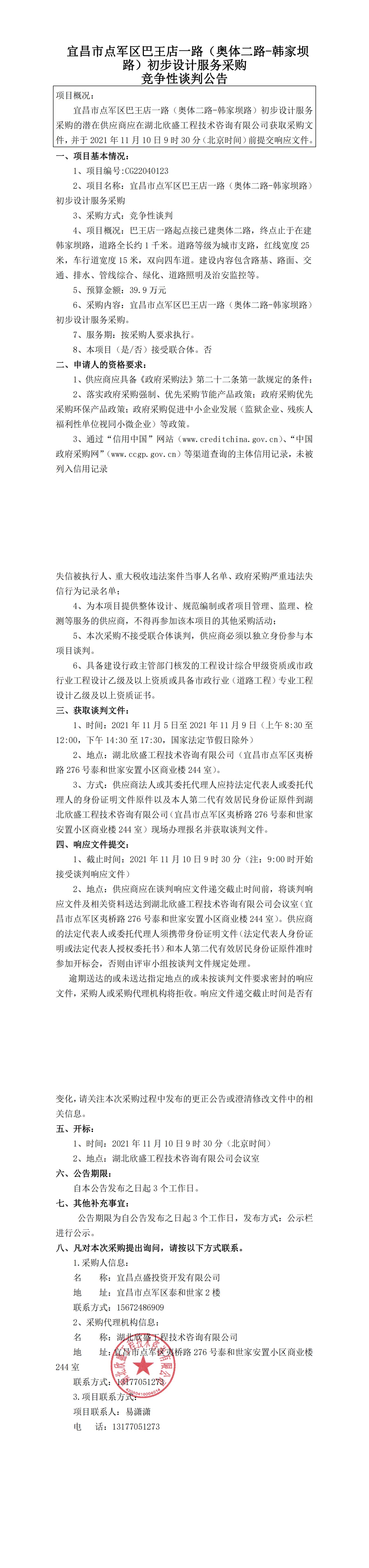 宜昌市點軍區(qū)巴王店一路(奧體二路-韓家壩路)初步設(shè)計服務(wù)采購競爭性談判公告