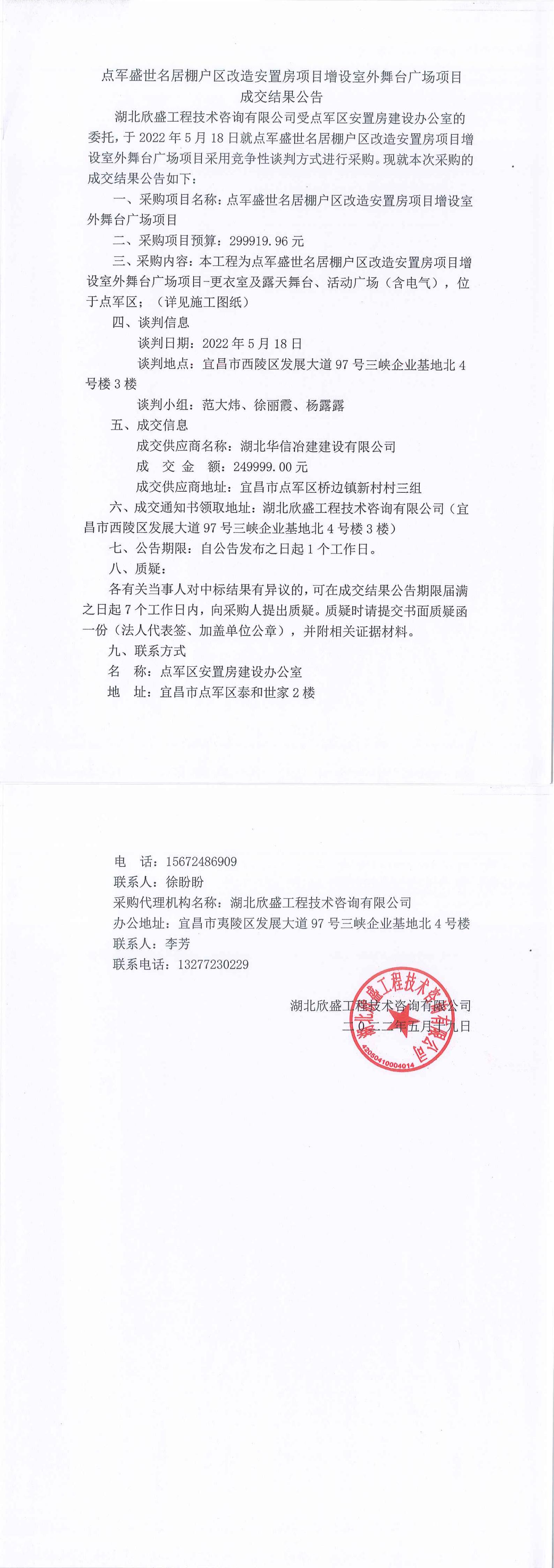 點(diǎn)軍盛世名居棚戶區(qū)改造安置房項(xiàng)目增設(shè)室外舞臺(tái)廣場項(xiàng)目成交公告