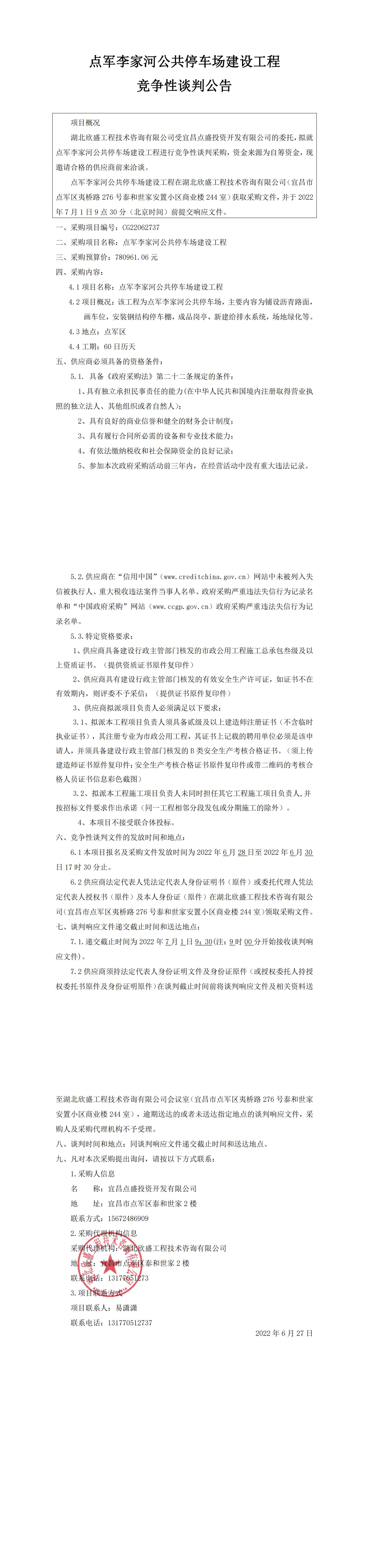 點(diǎn)軍李家河公共停車(chē)場(chǎng)建設(shè)工程競(jìng)爭(zhēng)性談判公告