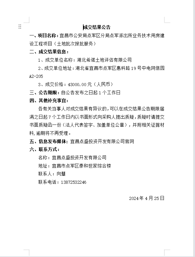 宜昌市公安局點(diǎn)軍區(qū)分局點(diǎn)軍派出所業(yè)務(wù)技術(shù)用房建設(shè)工程項(xiàng)目 (土地批次報(bào)批服務(wù))成交公告