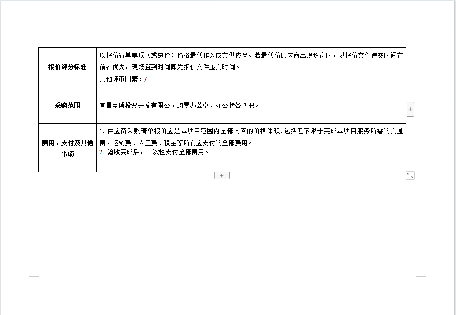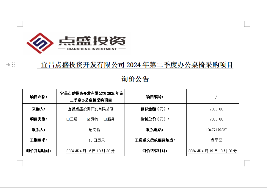 宜昌點(diǎn)盛投資開發(fā)有限公司2024年第二季度辦公桌椅采購項(xiàng)目 詢價(jià)公告