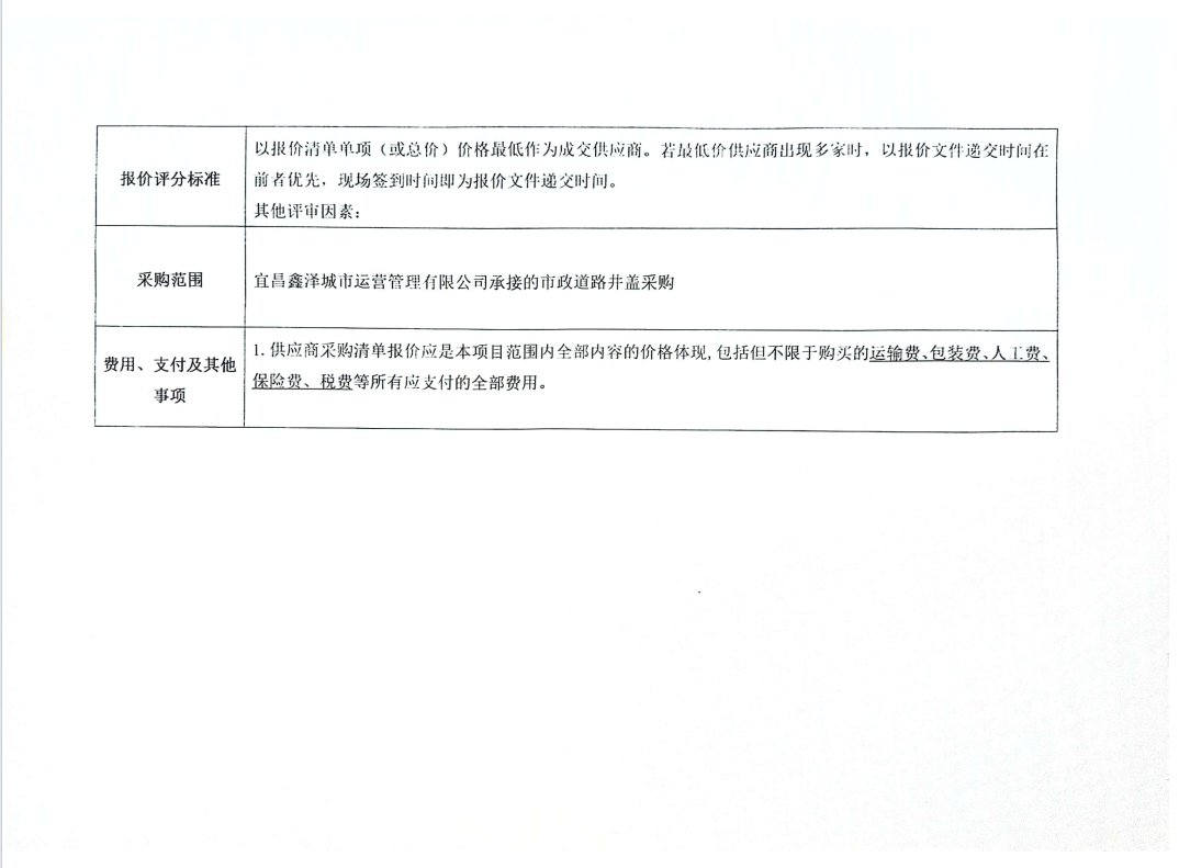 宜昌鑫澤城市運(yùn)營管理有限公司市政維修人行道井蓋采購項(xiàng)目詢價(jià)公告