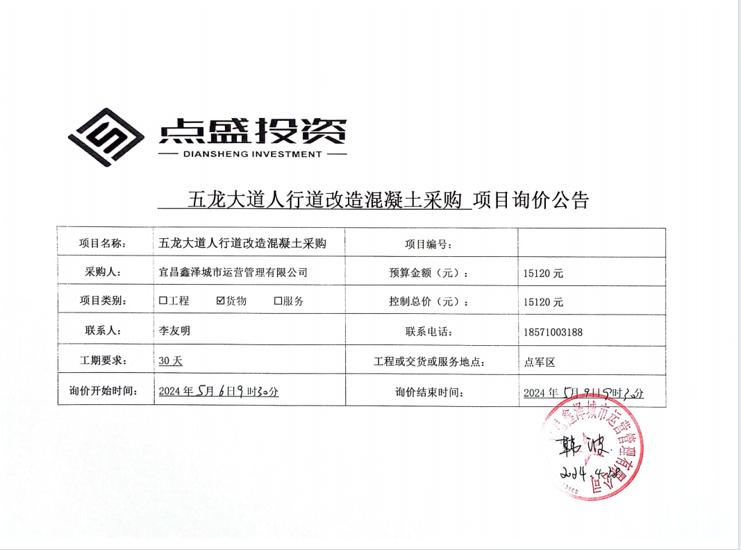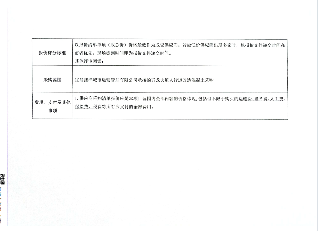 五龍大道人行道改造混凝土采購(gòu)項(xiàng)目詢價(jià)公告