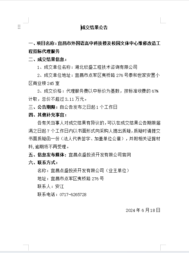 宜昌市外國(guó)語高中科技樓及校園文體中心維修改造工程招標(biāo)代理成交公告