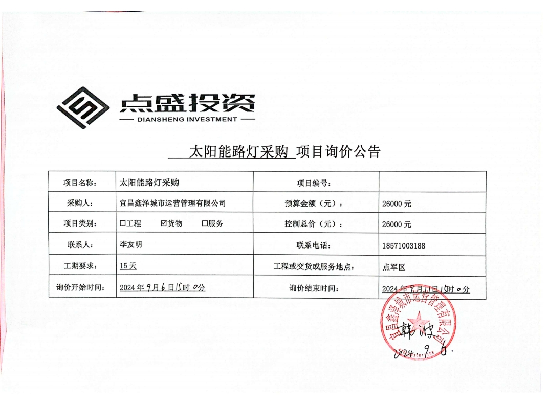 宜昌鑫澤城市運(yùn)營管理有限公司太陽能路燈采購項(xiàng)目詢價(jià)公告