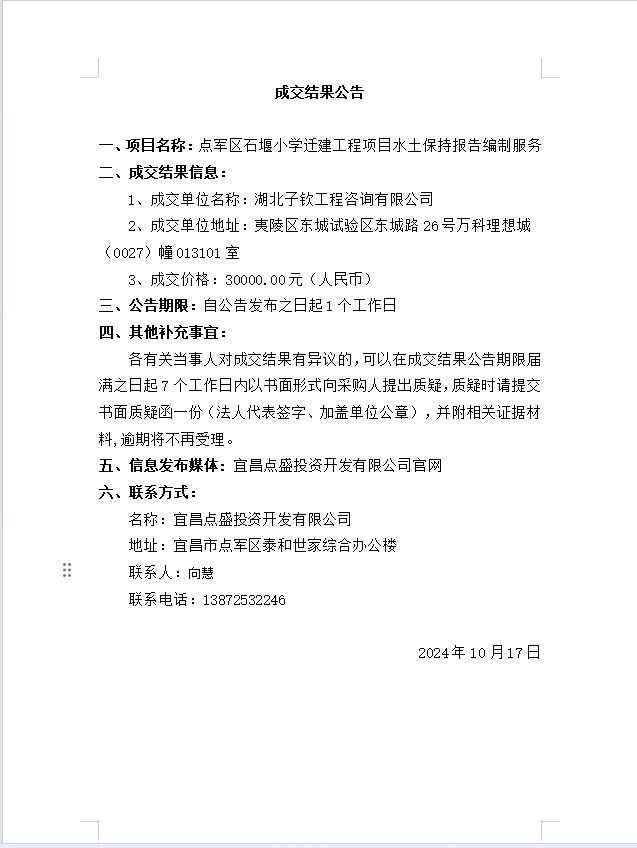 點軍區(qū)石堰小學(xué)遷建工程項目水土保持報告編制服務(wù)成交公告