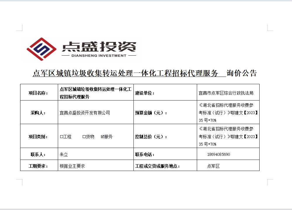 點軍區(qū)城鎮(zhèn)垃圾收集轉(zhuǎn)運處理一體化工程招標(biāo)代理服務(wù)詢價公告