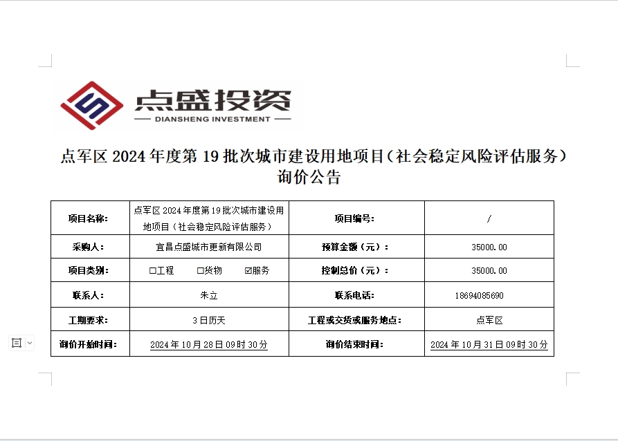 點(diǎn)軍區(qū)2024年度第19批次城市建設(shè)用地項(xiàng)目(社會(huì)穩(wěn)定風(fēng)險(xiǎn)評(píng)估服務(wù))詢(xún)價(jià)公告