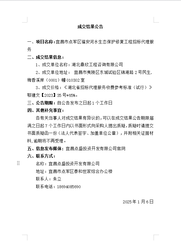 宜昌市點軍區(qū)福安河水生態(tài)保護修復工程招標代理服務成交公告