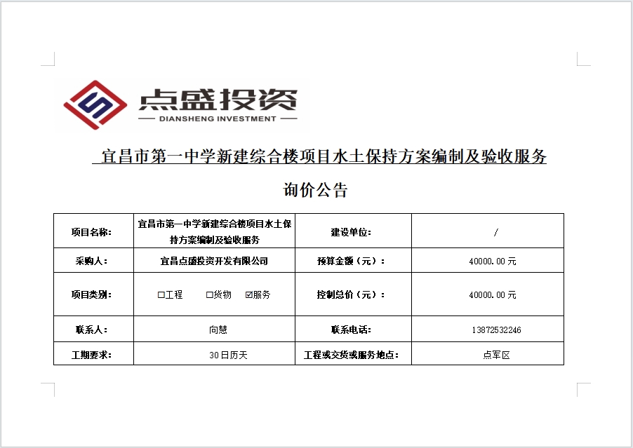 宜昌市第一中學(xué)新建綜合樓項(xiàng)目水土保持方案編制及驗(yàn)收服務(wù)詢價(jià)公告